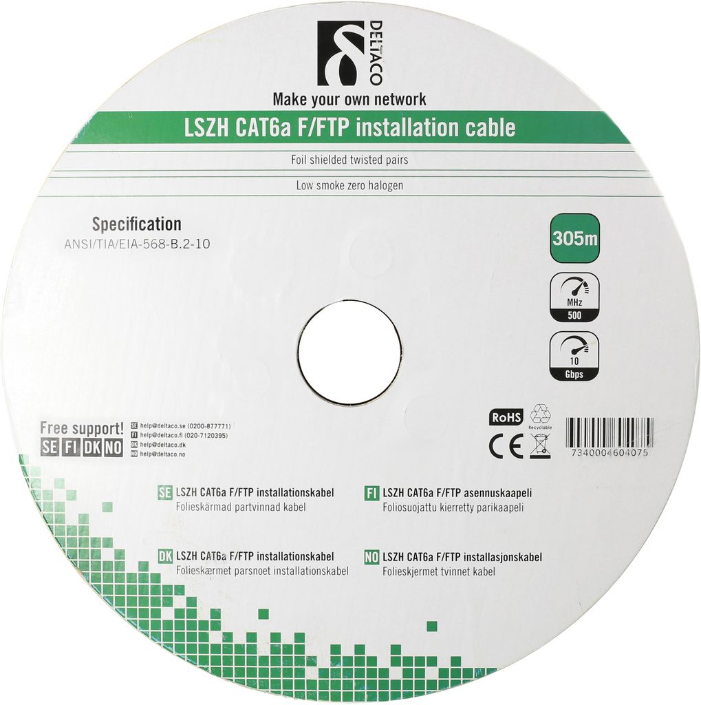DELTACO F/FTP Cat6a installationskabel, LSZH, 305m trumma, 500MHz, Delta-certifierad, vit