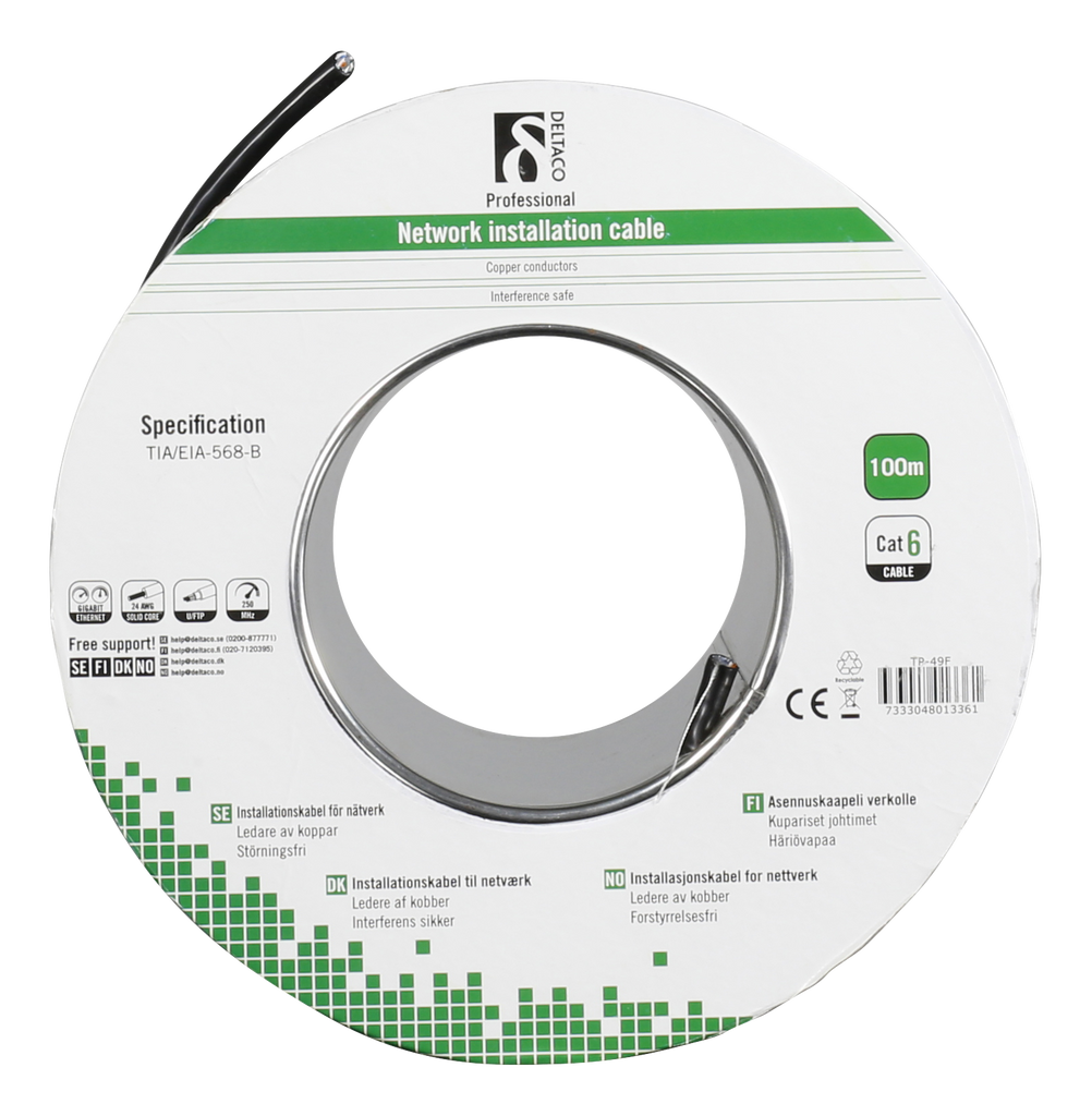 DELTACO F/UTP Cat6 installationskabel, för utomhusbruk, 100m rulle, 250MHz, Delta-certifierad, svart
