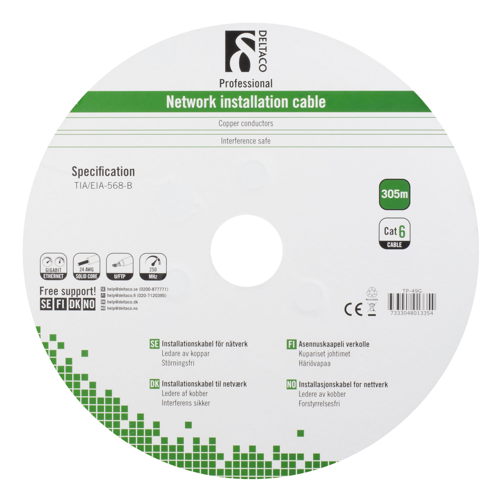 DELTACO F/UTP Cat6 installationskabel, för utomhusbruk, 305m trumma, 250MHz, Delta-certifierad, svart