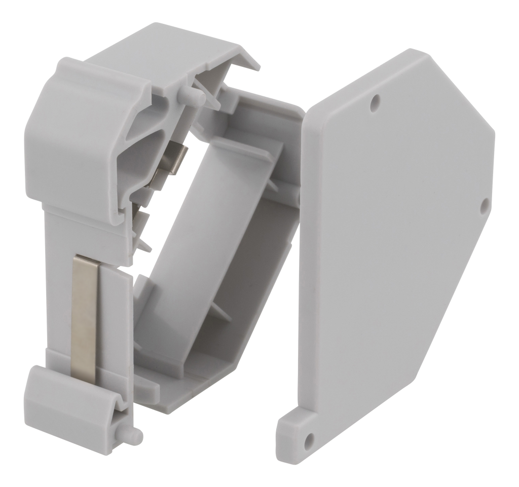 Hållaren monteras med ett snäppfäste och öppnas enkelt upp på ena sidan. Den rymmer uttag med mått upp till (BxDxH): 18x40x25mm, vilket tillåter en böjningsradie om 35mm.