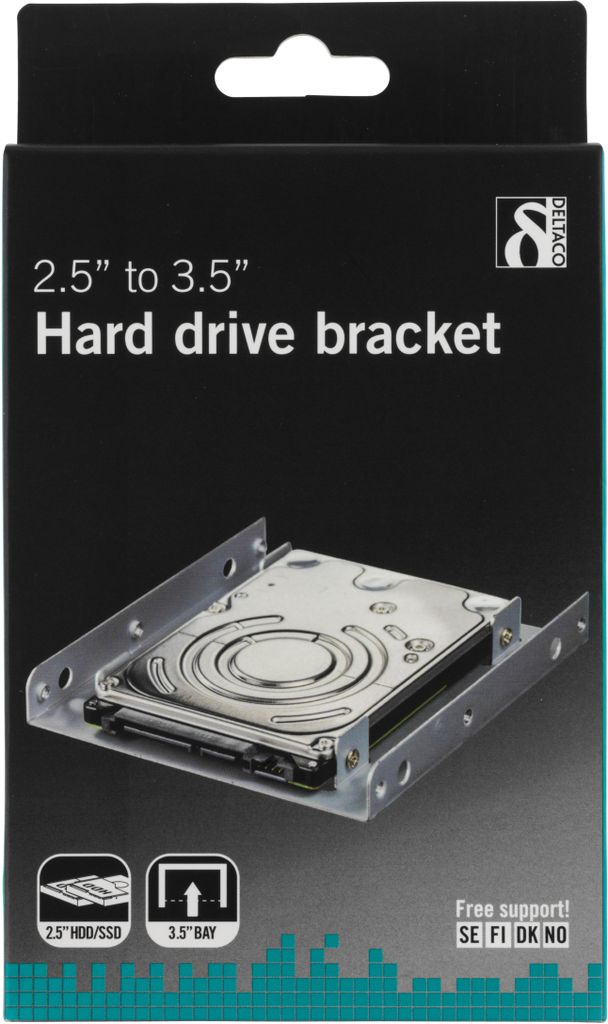 Produktbeskrivning DELTACO monteringsram för att kunna montera en 2,5" hårddisk i en 3,5"-plats, skruvar ingår, metallHårddisken på bilden ingår ej, endast för illustration.