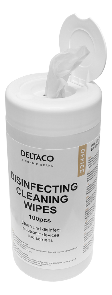 DELTACO OFFICE antibakteriella rengöringsservetter med klorbaserad formula är utformade för rengöring och desinficering av elektroniska apparater, särskilt skärmar.