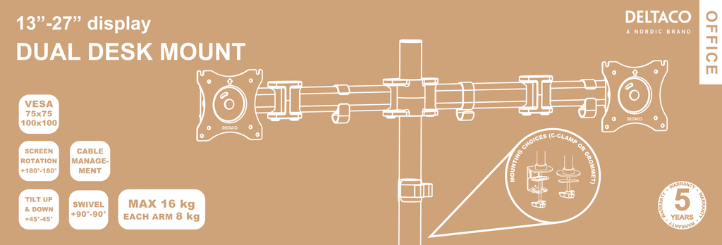 DELTACO OFFICE Skrivbordsfäste för LCD monitor, tiltbar, svängbar, rotera, 13"-27", svart