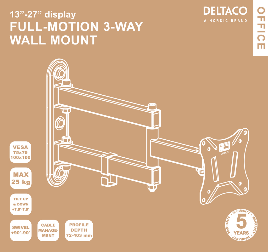 DELTACO OFFICE ARM-0251, väggfäste för 13"-27" LED/LCD platt-TV, VESA 75x75/100x100, max 25 kg, svart