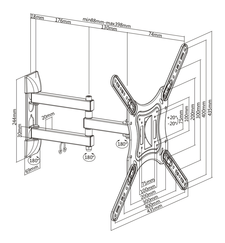 Den nya modellen ARM-0255 är designad för att vara kompatibel med alla platta paneler mellan 23"-55" upp till 30 kg. Genomtänkt konstruktion möjliggör enkel installation. Full-artikulation erbjuder maximal flexibilitet, förläng, tilta och sväng din skärm upp till 398 mm från väggen i alla riktningar för bästa betraktningsvinkel oavsett vart i rummet du sitter. inbyggda kabelklämmor håller dina kablar prydligt organiserade. Väggfästet är VESA kompatibelt med måtten 75x75, 100x100, 200x100, 200x200,400x200, 300x300, 400x400.