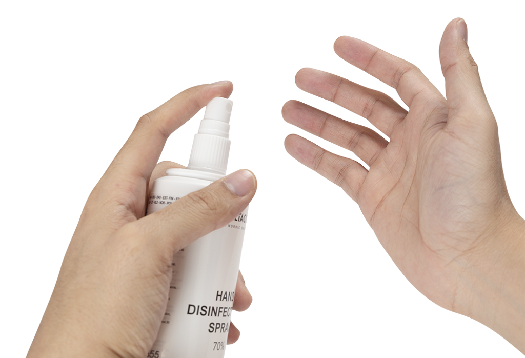 Handdesinfektionsspray som sprayas på rengjord hud, gnid in över hela händerna och låt lufttorka. Sprayen har även en mjukgörande effekt på huden tack vare innehållet av glycerin och Aloe vera.