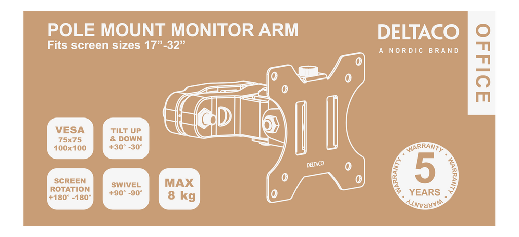DELTACO OFFICE Monitorarm för stolpmontering ARM-0304, 17-32", upp till 8kg, tilta, sväng, rotera, vit