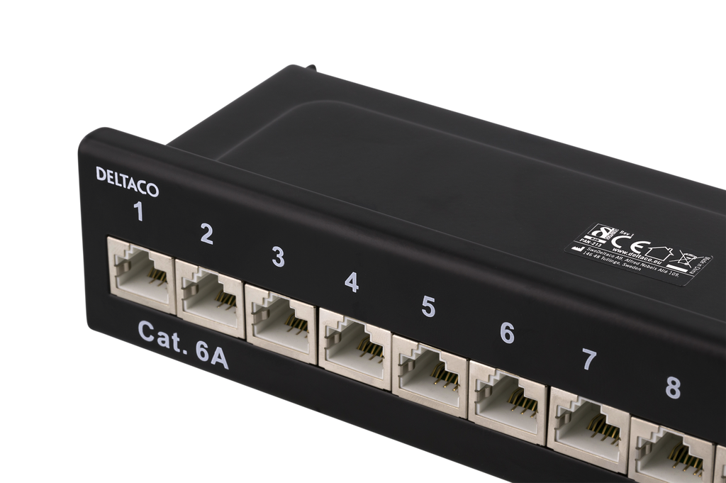 DELTACO Patchpanel, 12xRJ45, Cat6a, väggmonterbar, 10Gbps, svart