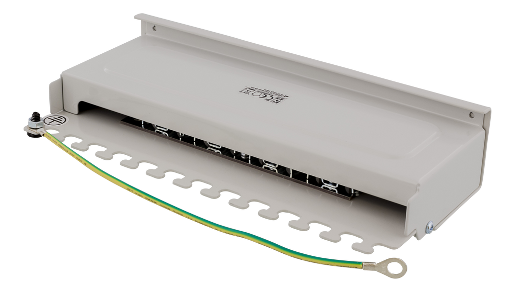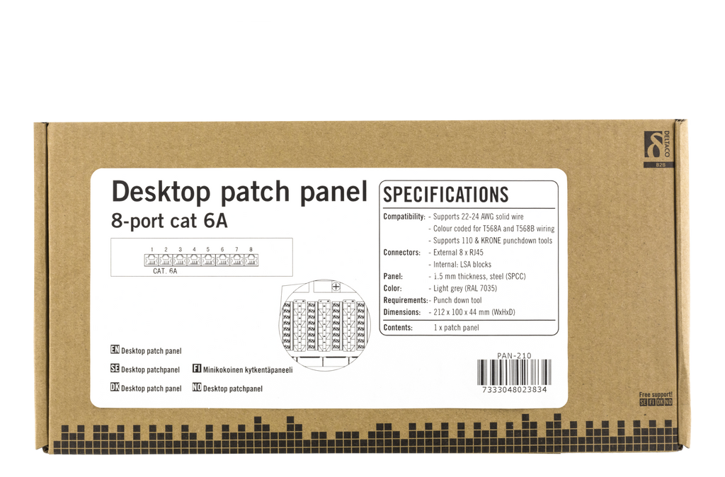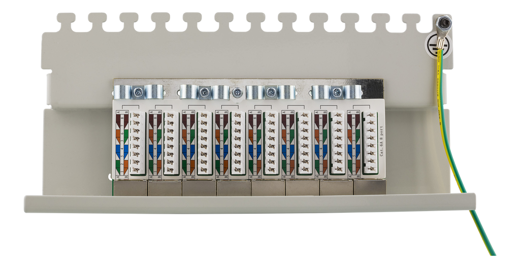 En patchpanel med 8st RJ45-portar anpassad för installation direkt på plana ytor då det finns två hål på undersidan kan den lätt sättas på t.ex. en vägg. På baksidan sitter ett täcklock som enkelt skruvas på och av för att skydda krone-plintar och kablage. Kablaget går också att skruva fast för en säker installation.