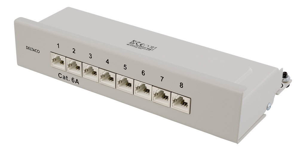 DELTACO Patchpanel, 8xRJ45, Cat6a, väggmonterbar, 10Gbps, Krone-plintar, metall, grå