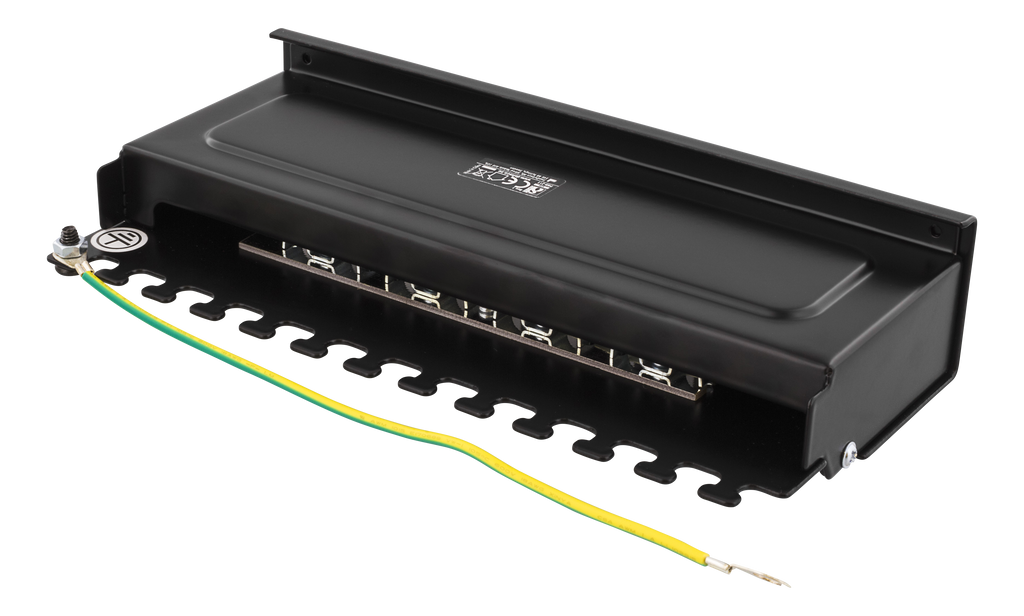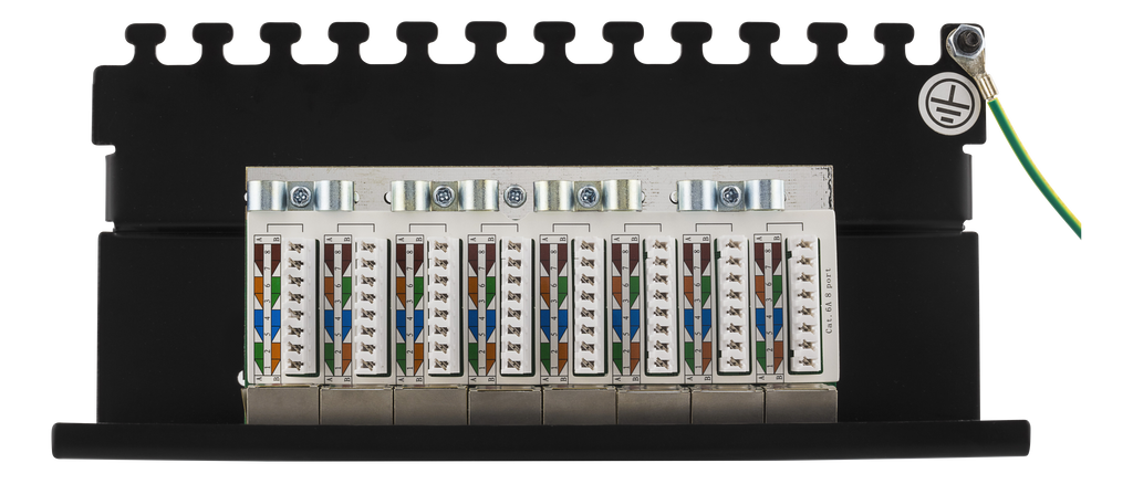 En patchpanel med 8st RJ45-portar anpassad för installation direkt på plana ytor då det finns två hål på undersidan kan den lätt sättas på t.ex. en vägg. På baksidan sitter ett täcklock som enkelt skruvas på och av för att skydda krone-plintar och kablage. Kablaget går också att skruva fast för en säker installation.