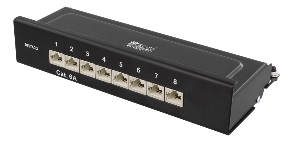 DELTACO Patchpanel, 8xRJ45, Cat6a, väggmonterbar, 10Gbps, Krone-plintar, metall, svart