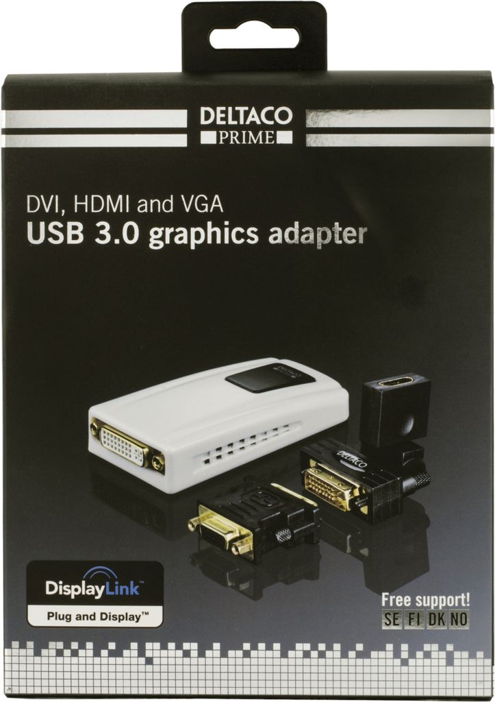 DELTACO PRIME USB 3.0 till DVI/HDMI/VGA-adapter, fungerar som ett extra grafikkort, DVI-I Dual Link ho, USB 3.0 Typ Micro-B ho, 2048x1152, vit