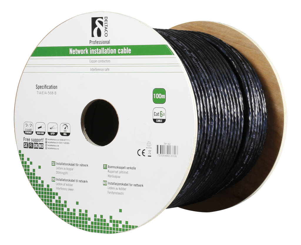 DELTACO S/FTP Cat6a installationskabel, för utomhusbruk, 100m rulle, 250MHz, Delta-certifierad, svart