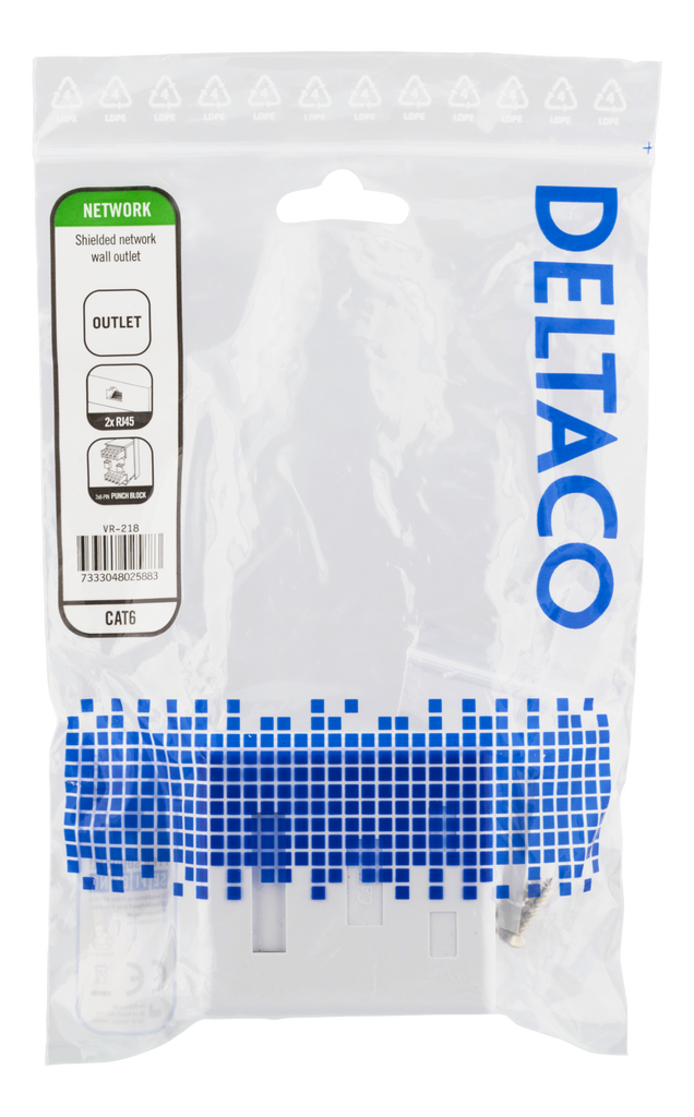 Produktbeskrivning DELTACO skärmat vägguttag, utanpåliggande FTP 2xRJ45, Cat6, vit Mått (BxDxH):63x25x68mm Vikt: 47g Förpackningsinnehåll: 1xvägguttag, 2x skruvar och dubbelhäftande tejp.
