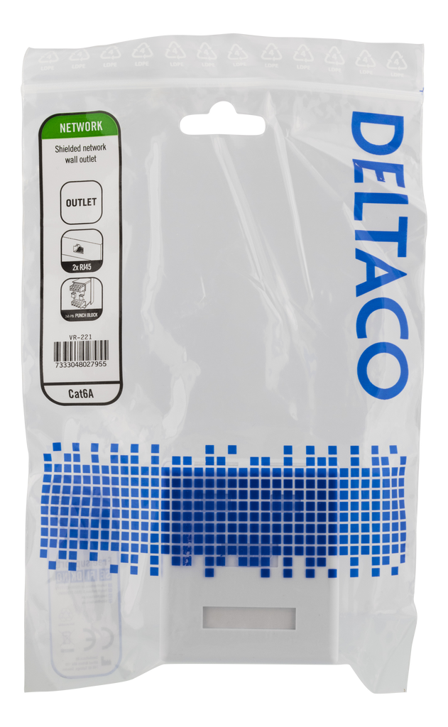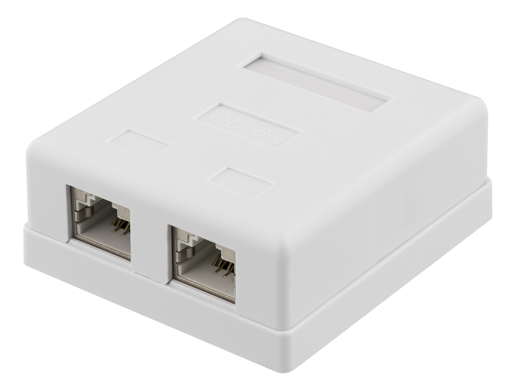 Produktbeskrivning DELTACO skärmat vägguttag, utanpåliggande FTP 2xRJ45, Cat6A, vit Mått (BxDxH): 62x27x68 mm Vikt: 50g