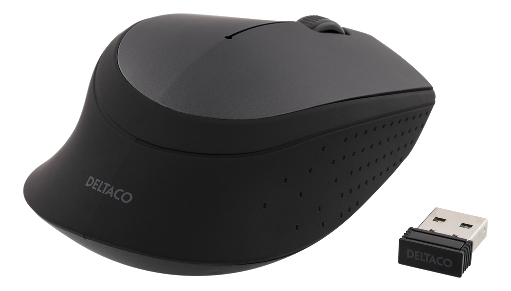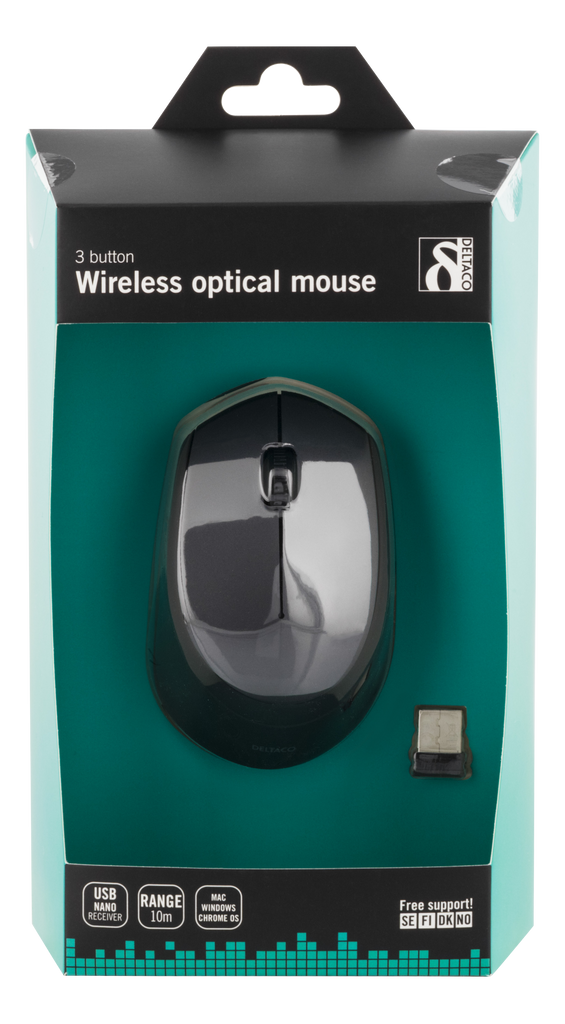 DELTACO trådlös optisk mus, 1200 DPI, 125 Hz, 3 knappar med scroll, 2.4GHz USB nano-mottagare, svart