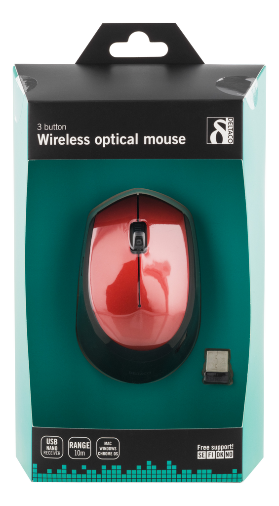 DELTACO trådlös optisk mus, 1200 DPI, 125 Hz, 3 knappar med scroll, 2.4GHz USB nano-mottagare, röd