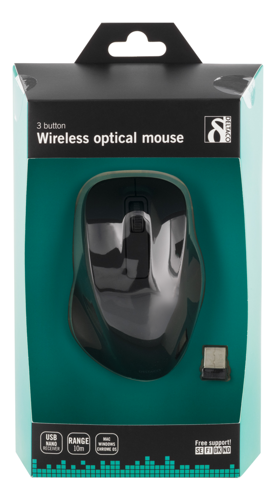DELTACO trådlös optisk mus, 1200 DPI, 125 Hz, 3 knappar med scroll, 2.4GHz USB nano-mottagare, svart