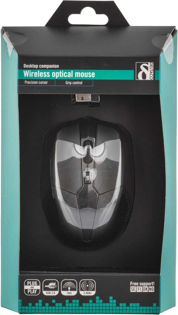 DELTACO trådlös optisk mus, 800-1600 DPI, 125 Hz, 7 knappar med scroll, 2.4GHz USB nano-mottagare, svart