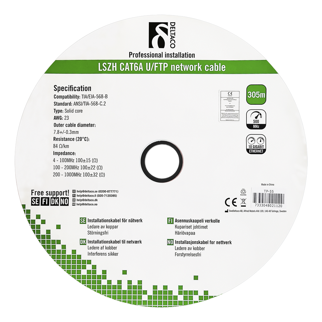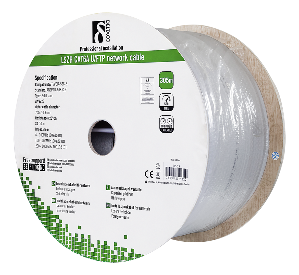 DELTACO U/FTP Cat6a installationskabel, 305m, 500MHz, Delta-certifierad, LSZH, grå