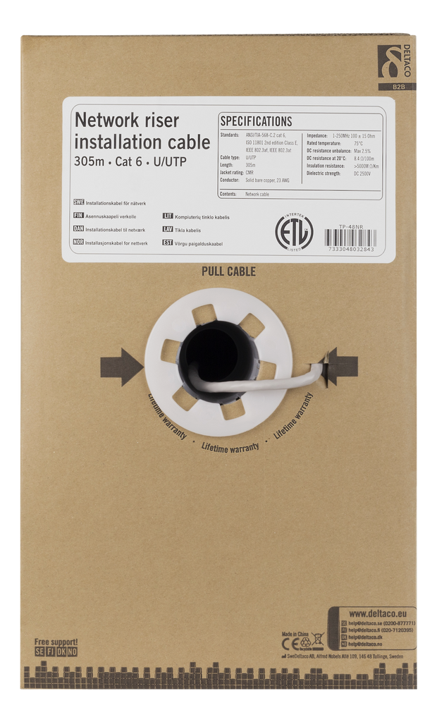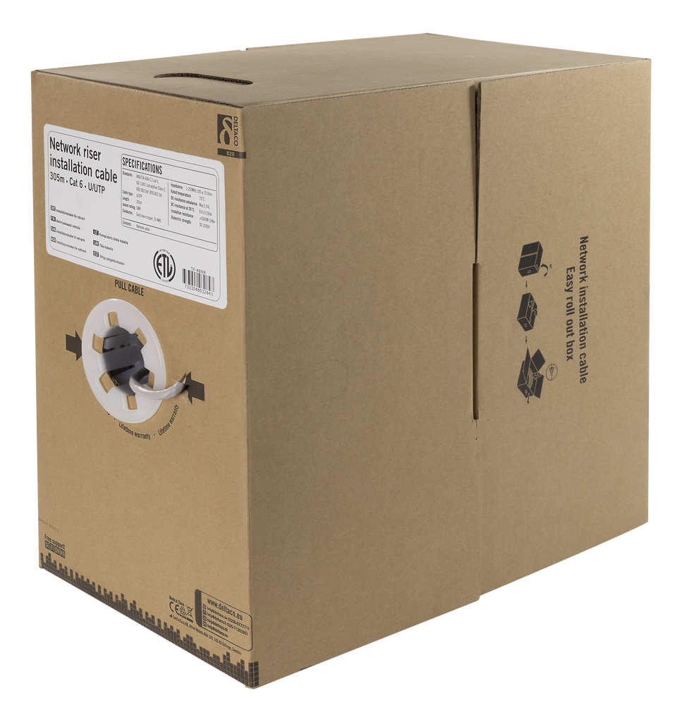 DELTACO U/UTP Cat6 riser installationskabel, 305m box, 250MHz, Delta-certifierad, CMR, grå