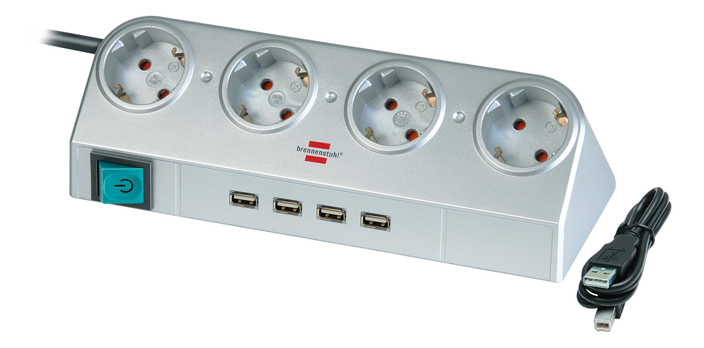 Brennenstuhl Desktop-Power, Grenuttag med USB-Hubb, 4xCEE 7/4 uttag, 1xCEE 7/7 anslutning, 1,8m kabel, silver
