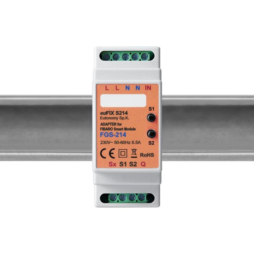 Produktbeskrivning Genom att använda denna professionella adapter kan du montera Fibaros Double Switch FGS-214 på DIN-skena. euFix S214 har två knappar som är anslutna till ingångarna på FGS-214Fibaro Smart Module säljs separat.