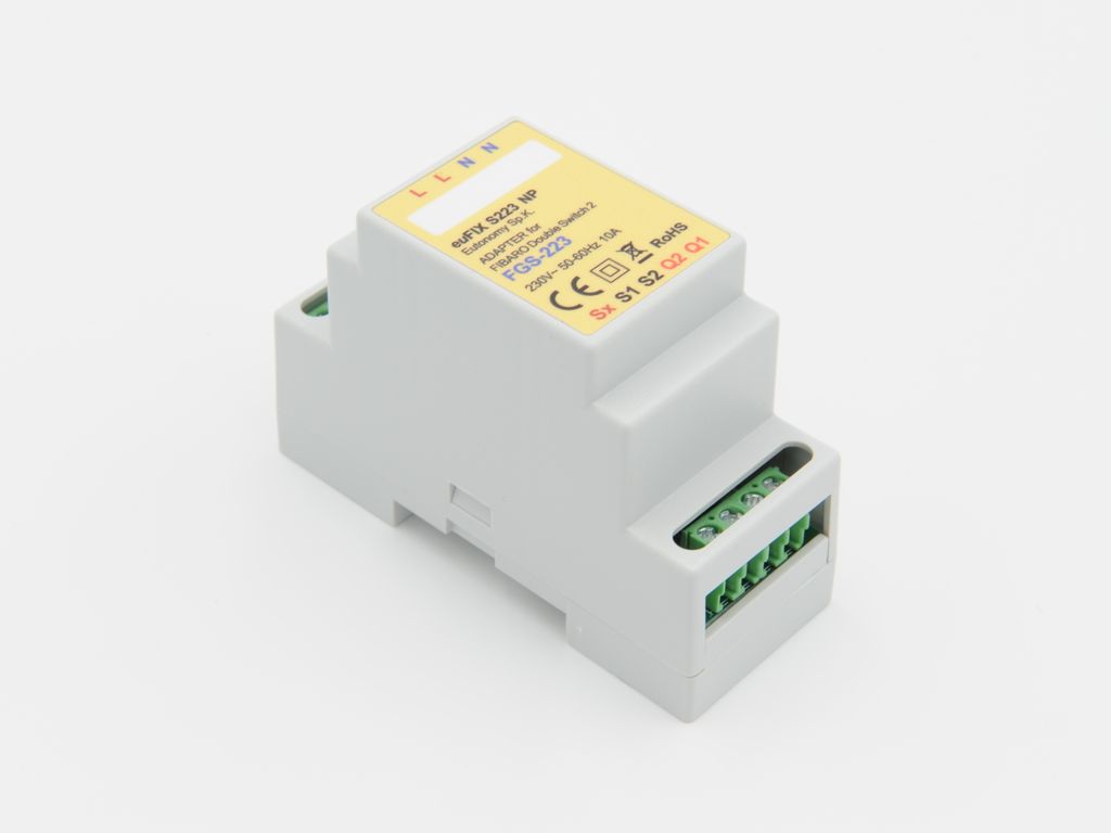 Produktbeskrivning Genom att använda denna professionella adapter kan du montera Fibaros brytare FGS-223 på DIN-skena. euFix S223NP har inte några knappar. Fibaro Double Switch säljs separat.