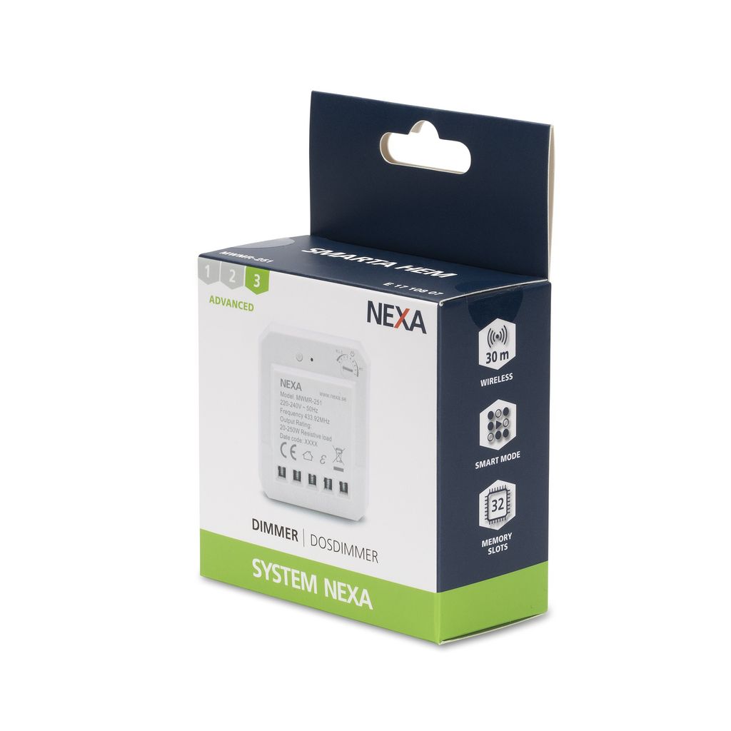 Inbyggnadsdimmer för fast installation. Liten och kompakt storlek med ingång för återfjädrande brytare (230VAC). Ställbar mellan framkantsstyrd fasdimring och bakkantsstyrd fasdimring, samt lägsta dimmernivå. Mottagaren behöver både fas och nolla och har full kompatibilitet med övriga produkter i System Nexa. Smart Mode-funktionen låter dig spara upp till tre olika scenario som sedan aktiveras med en Nexa Smart Mode sändare.