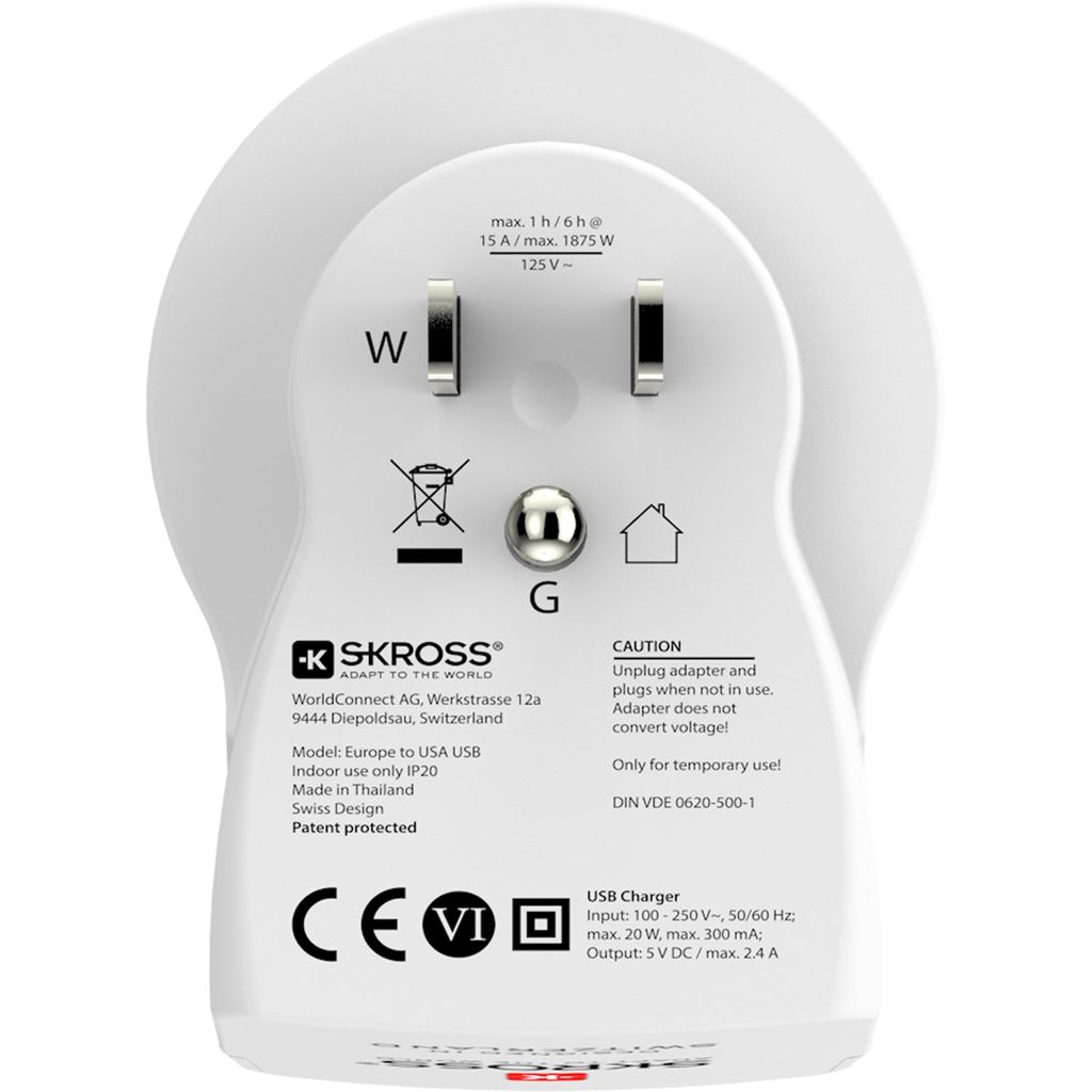 Den amerikanska vägguttagsstandarden används på över 50 destinationer runt om i världen. Denna reseadapter från SKROSS® ger en pålitlig och enkel anslutning för enheter med en Schuko- eller Euro-kontakt. Den fungerar även till effektkrävande enheter som bärbara datorer och hårtorkar (kontrollera maxeffekt), samtidigt som det möjliggör effektiv laddning av två USB-enheter.