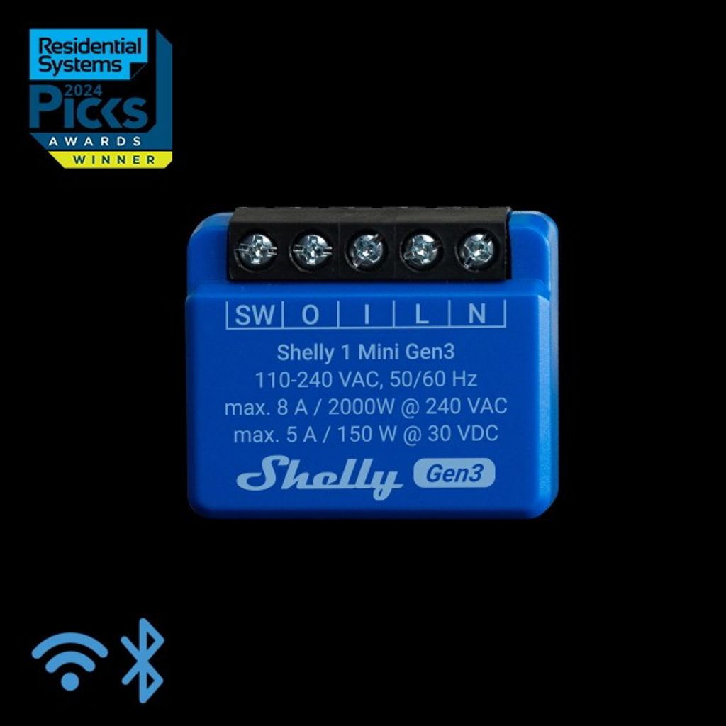 Shelly 1 Mini Gen 3 är en ultrakompakt smart reläbrytare som gör det möjligt att styra belysning, motorer och andra elektriska enheter på distans via WiFi och Bluetooth.
