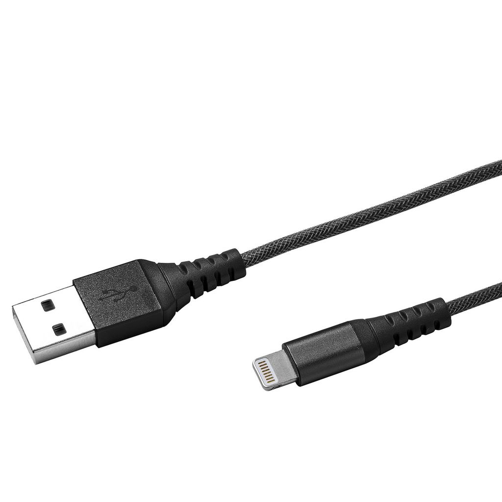 Extra tålig USB-kabel med Lightning-kontakt, 0,25 meter lång och MFi-certifierad. Kabeln har en nylonbeläggning, som ger hög slitstyrka och ger upp till 10 gånger längre livslängd än standardkablar. Snabbladdning tack vare stöd för 2,4A.