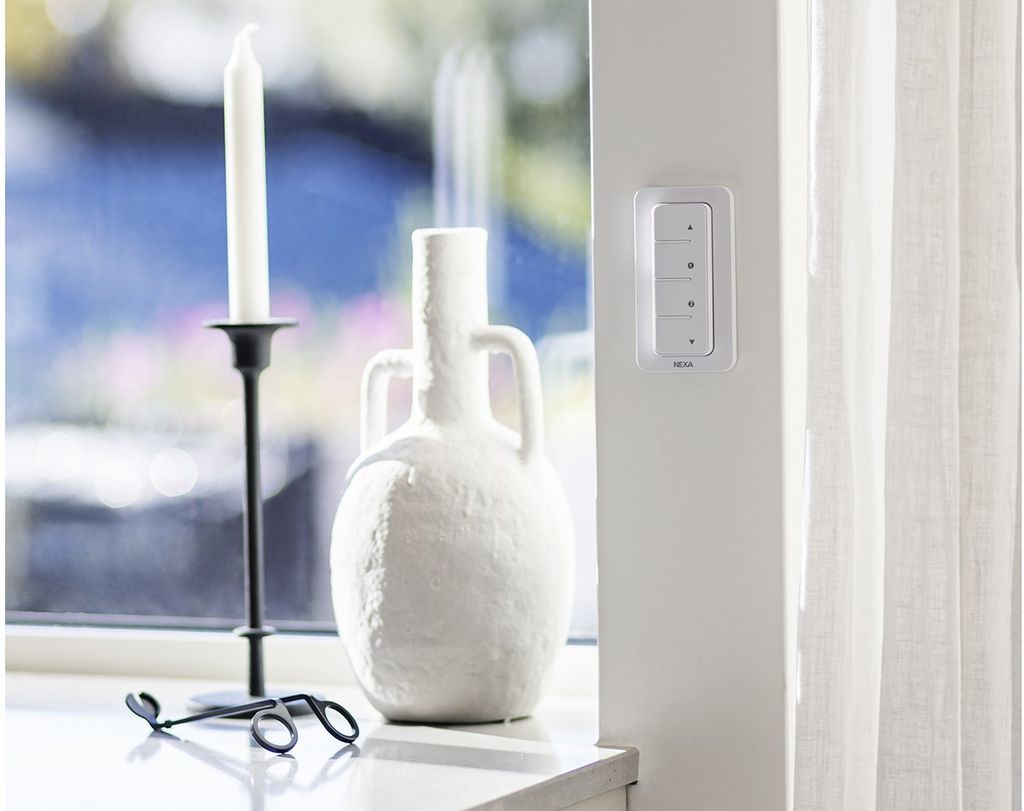 Fjärrkontroll med magnetiskt väggfäste för styrning av MJLR-2000 inbygg-nadsmottagare för markiser, filmdukar, rullgardiner med mera.