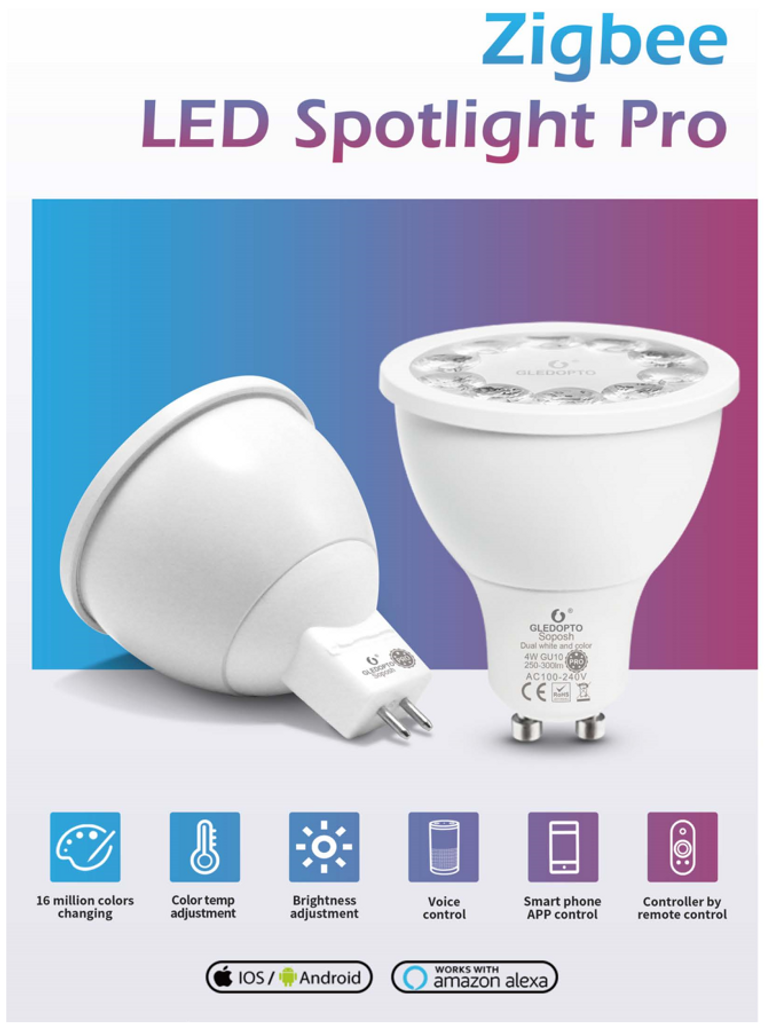 Smart spotlight från Gledopto. Justera både färgtemperatur och ljusstyrka. Fungerar bra med t ex Philips Hue systemet.