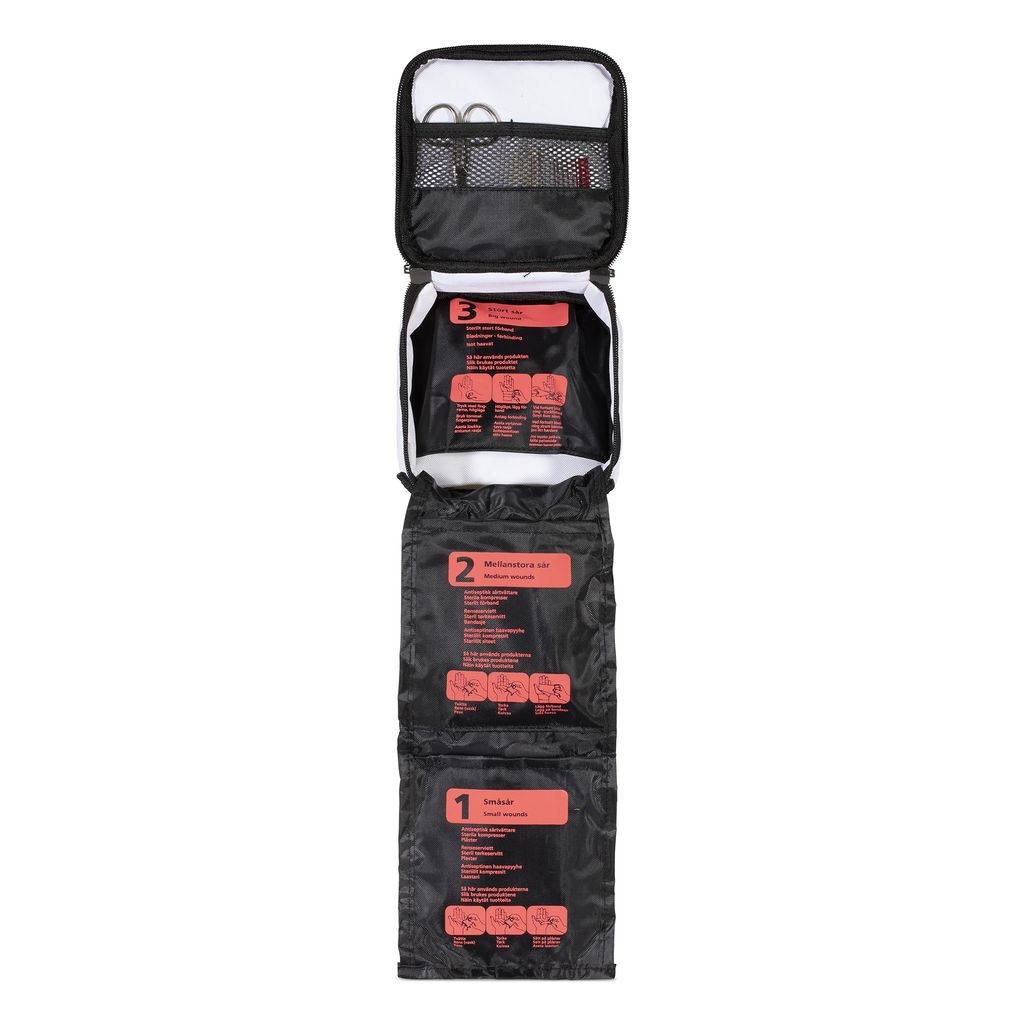 Första Hjälpenväska, 36 delar. Väskan har tre fack samt en nätficka och innehåller det du behöver för att hantera allt från småsår till lite större sår samt små brännskador.