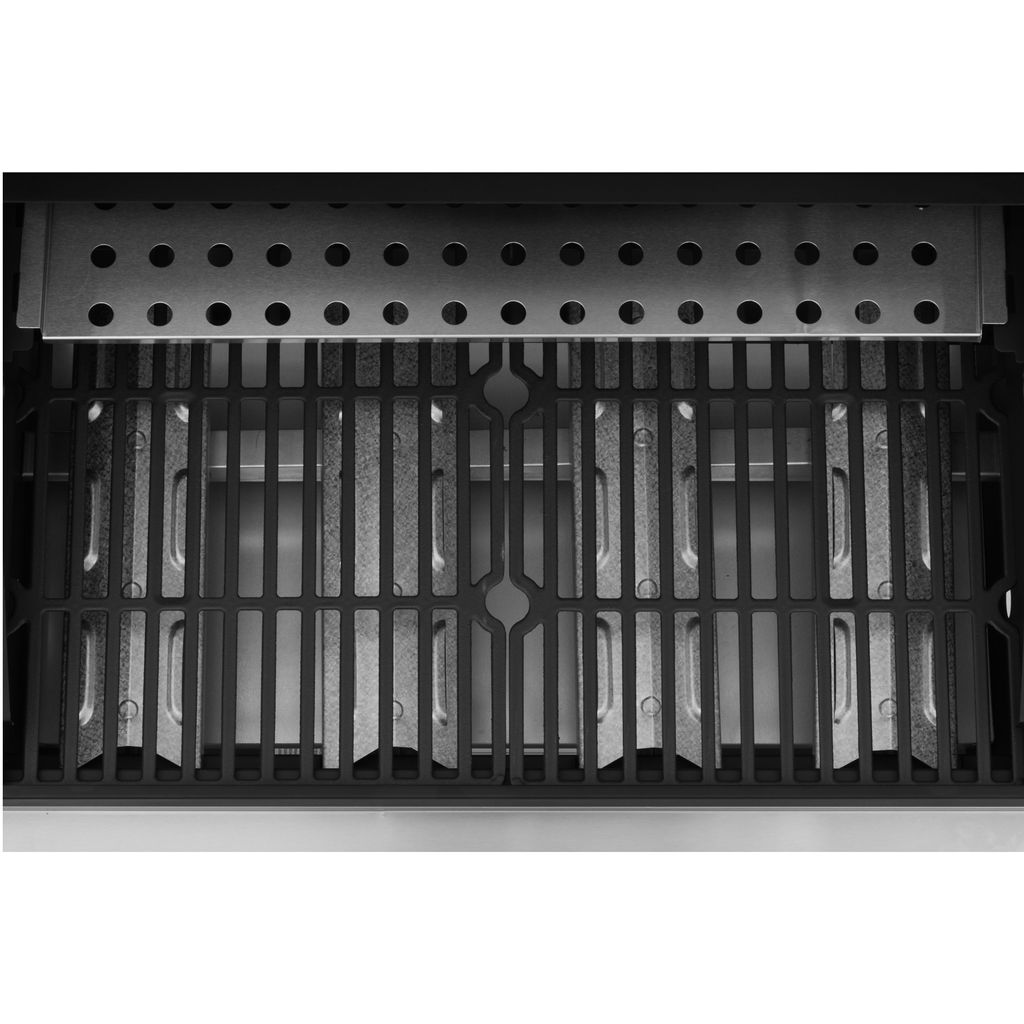 Grillytan är 63 x 38 cm, delad i två mattemaljerade gjutjärnsgaller. Varmhållningsgallret är 55,5 x 10,5cm i rostfritt stål SS430 och har värmefördelningsplåtar i zinkbelagt stål.
