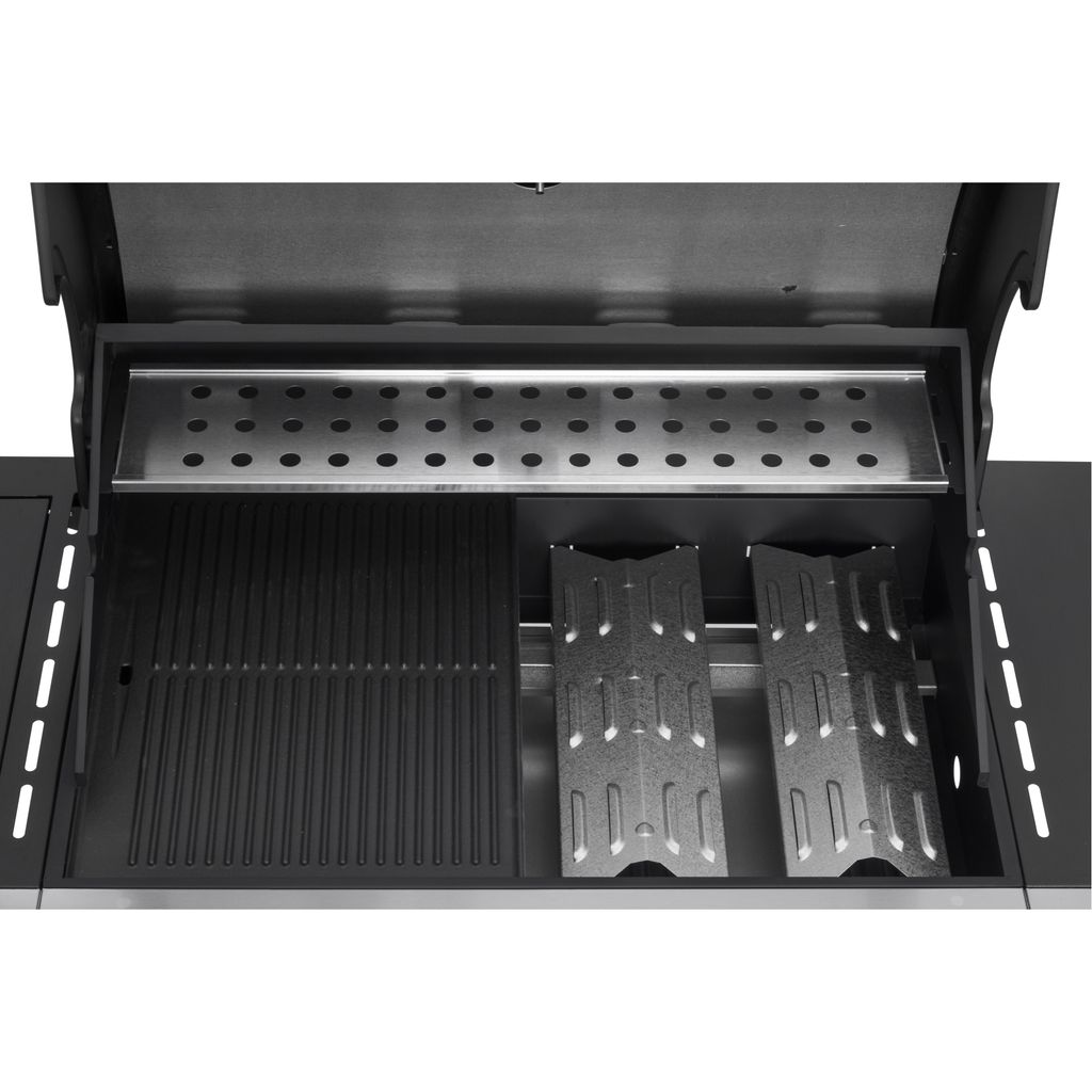 Louisville gasolgrill i rostfritt stål med fyra huvudbrännare och sidobrännare.