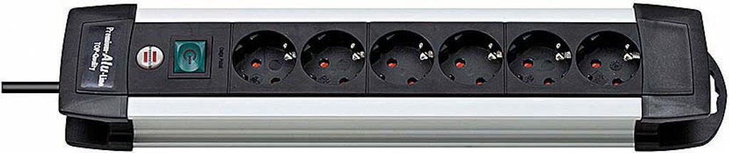 Produktbeskrivning Brennenstuhl Premium Alu-Line, grenuttag med 6xCEE 7/4 uttag, 1xCEE 7/7 anslutning, central brytare, 3m kabel, petskyddad, aluminium/plast, svart/silver