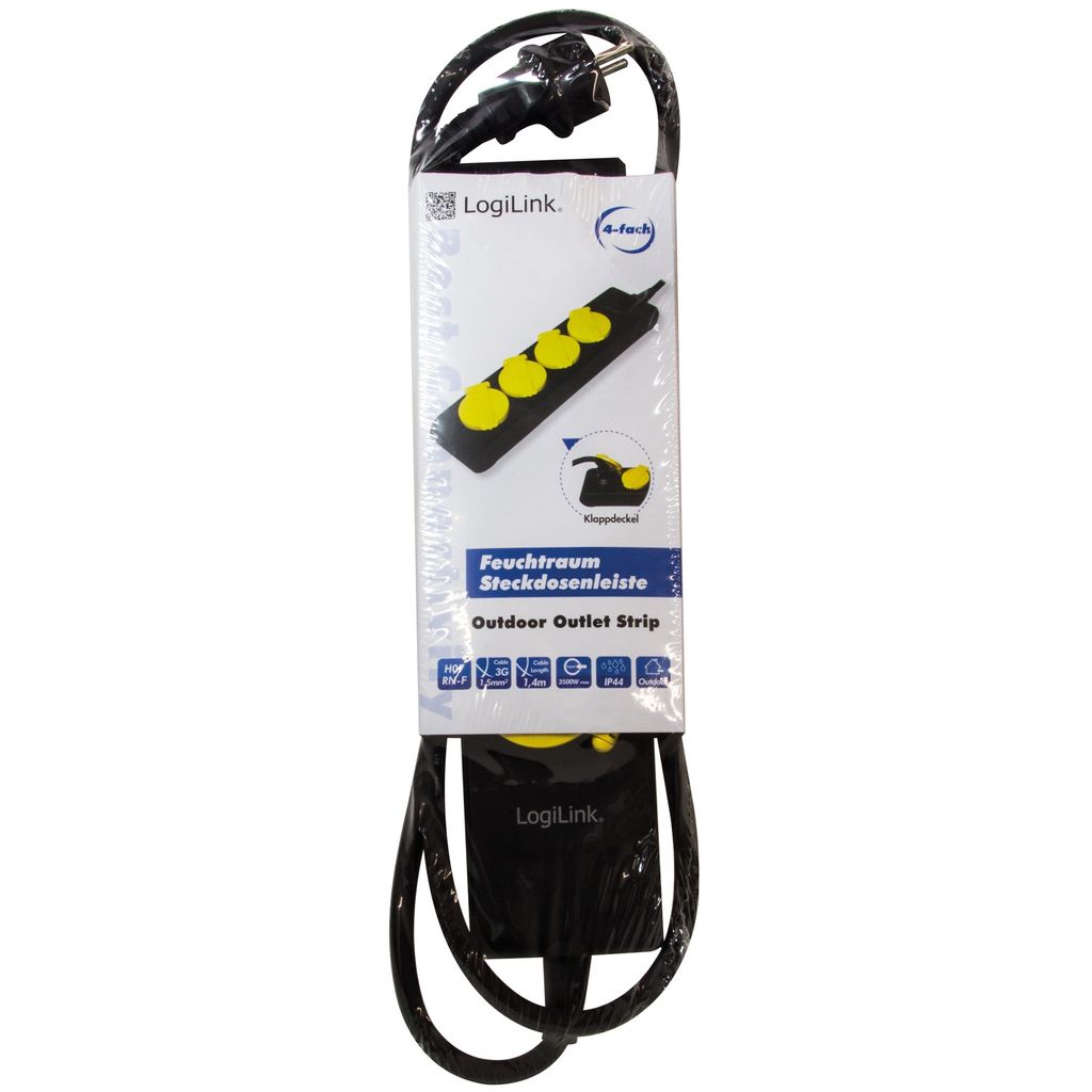 Grenuttag med fyra uttag och en kabellängd på 1,4 m. Lämplig för temporär användning i fuktiga utrymmen och miljöer.