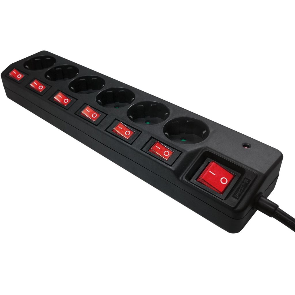 LogiLinks 6-vägsgrenuttag har plats för sex elektriska enheter samtidigt. Strömmen för varje uttag kan brytas individuellt, eftersom varje uttag har sin egen upplysta på/av-brytare.