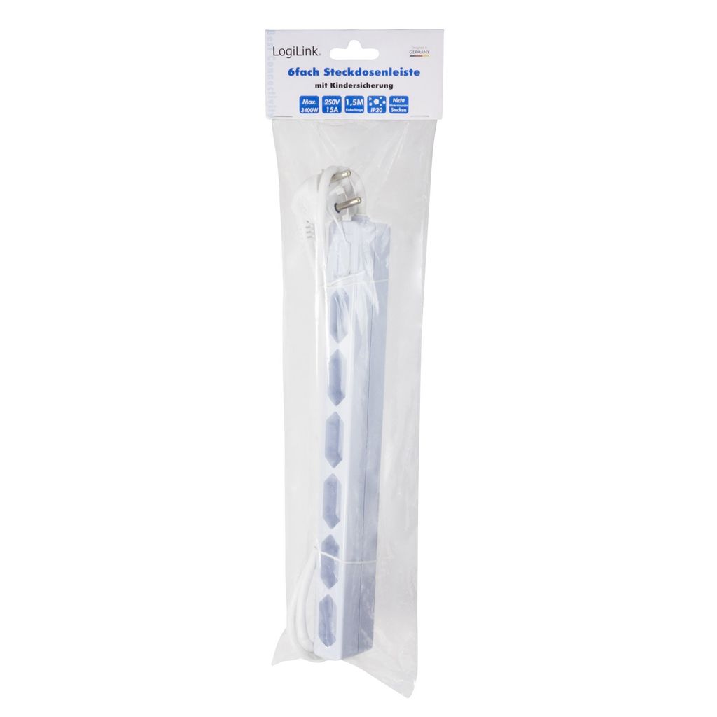 Ett 6-vägs Euro-grenuttag som är väldigt utrymmesbesparande tack vare sin smala design och passar till exempel bredvid eller bakom skåp, även där vanliga grenuttag inte får plats. Upp till tre enheter med Euro-stickkontakter kan anslutas samtidigt. Uttagen har petskydd.