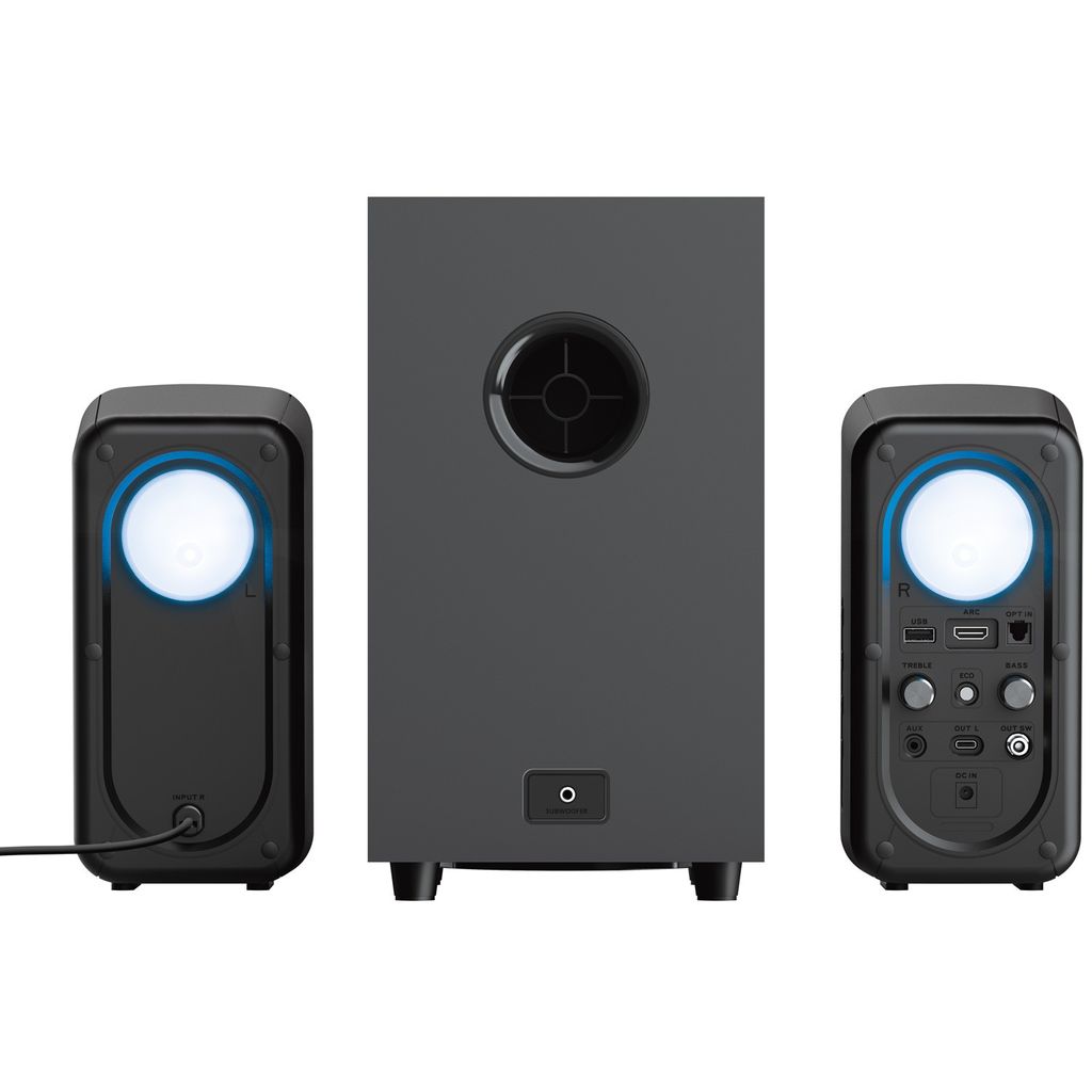 Kraftfullt 2.1-högtalarset med anpassningsbar RGB LED-belysning, HDMI-ingång och trådlös Bluetooth-teknik