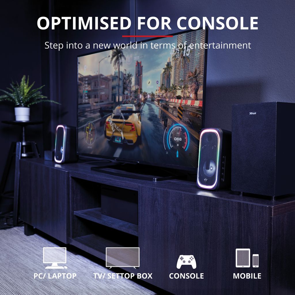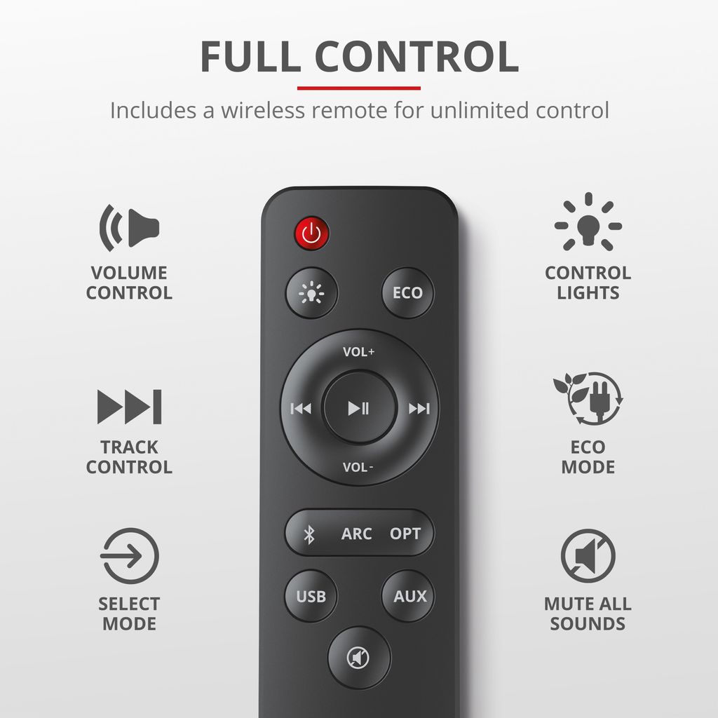 Varför välja högtalakit baserat på vilken anslutning den använder? Trust Rumax fungerar med i stort sett vad som helst: HDMI ARC, optisk, 3,5 mm. Det finns Bluetooth så att du kan ansluta din telefon trådlöst eller bara koppla in ett USB-minne med MP3-filer. Möjligheterna är oändliga; Anslut The Trust Rumax till din PC eller bärbara dator, din spelkonsol, din TV eller digitalbox. Upplev ett nytt sätt att spela spel, titta på film eller lyssna på musik.