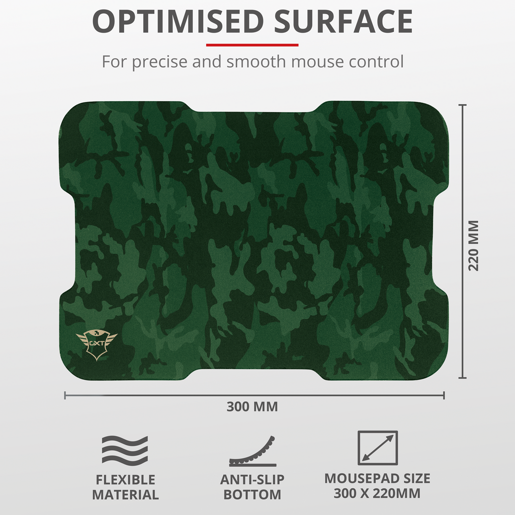 Med Trust GXT 781 Rixa Mouse & Mouse Pad får du två avgörande tillbehör till din speldator: En exakt mus med 6 knappar och en musmatta, båda i camodesign.