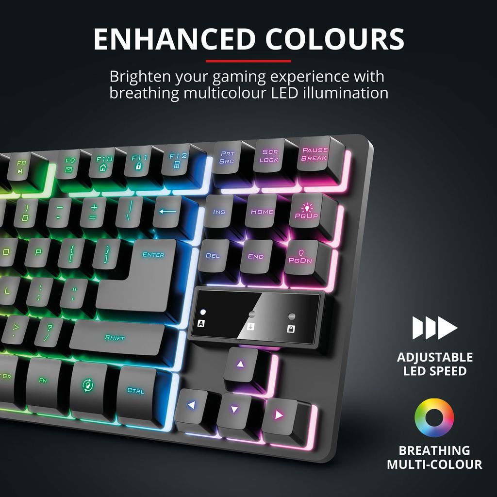 Trust GXT 833 Thado är ett tenkeyless gamingtangentbord och är 20 % mindre än tangentbord med numerisk tangentbord, vilket gör det lättare att ta med sig. Dess metallbakstycke gör Thado robust, medan LED-belysningen lyser upp festen.