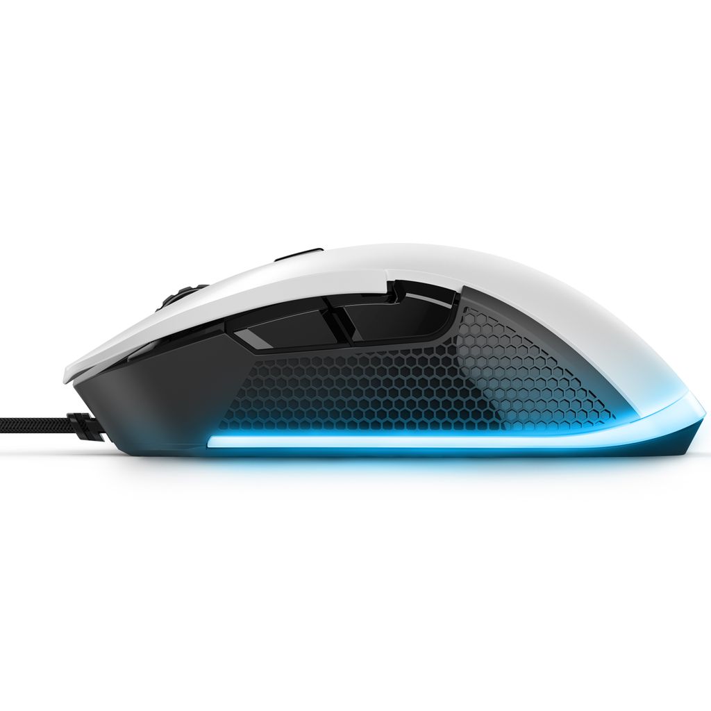 Musens formfaktor är speciellt utformad för högerhänta spelare och ger dem intuitiv kontroll. De texturerade sidorna ger grepp och komfort i timmar och de släta glidkuddarna med låg friktion ger snabba rörelser på vilken yta som helst.