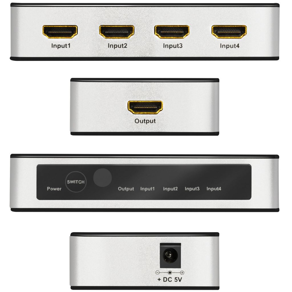 In: 4x HDMI-A-hona, 1x DC-uttag