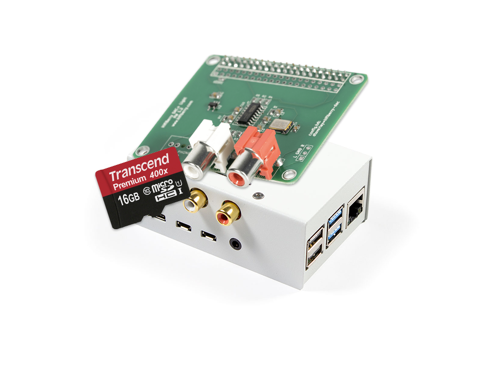 I paketet ingår ett case för Raspberry Pi 4, en HiFiBerry DAC+ Light samt ett 16GB Minneskort från Transcend.