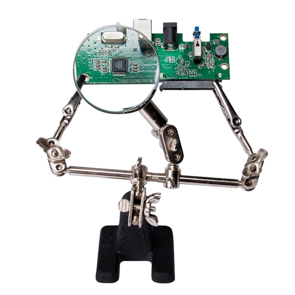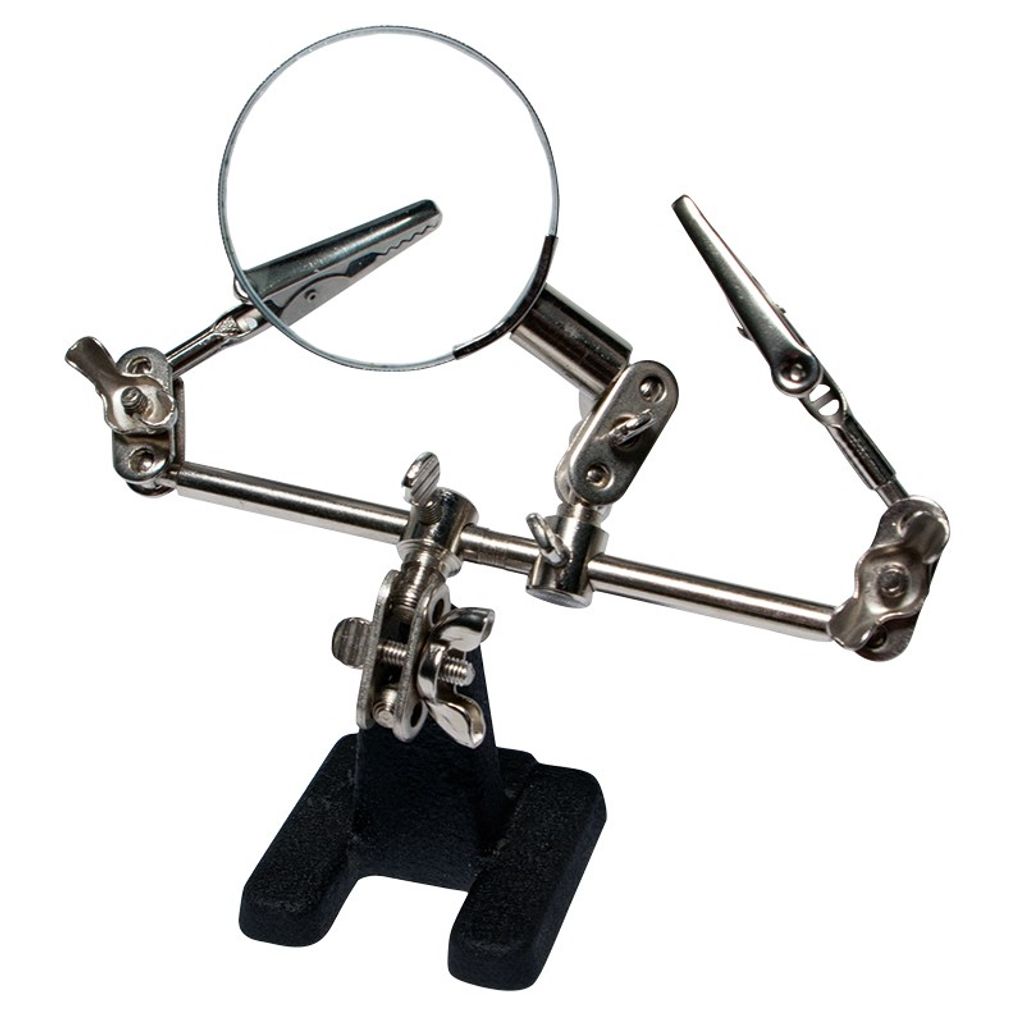 Den hjälpande handen kan hålla små komponenter, kretskort, eller något som kräver lödning eller fin montering. Levereras med förstoringsglas. Klämmorna kan anpassas till alla vinklar.